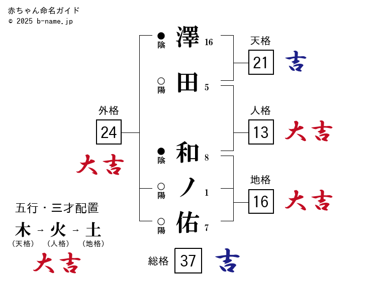 和ノ佑さんと相性の良い相手は地格の五行が「土・金・火」の人です。
